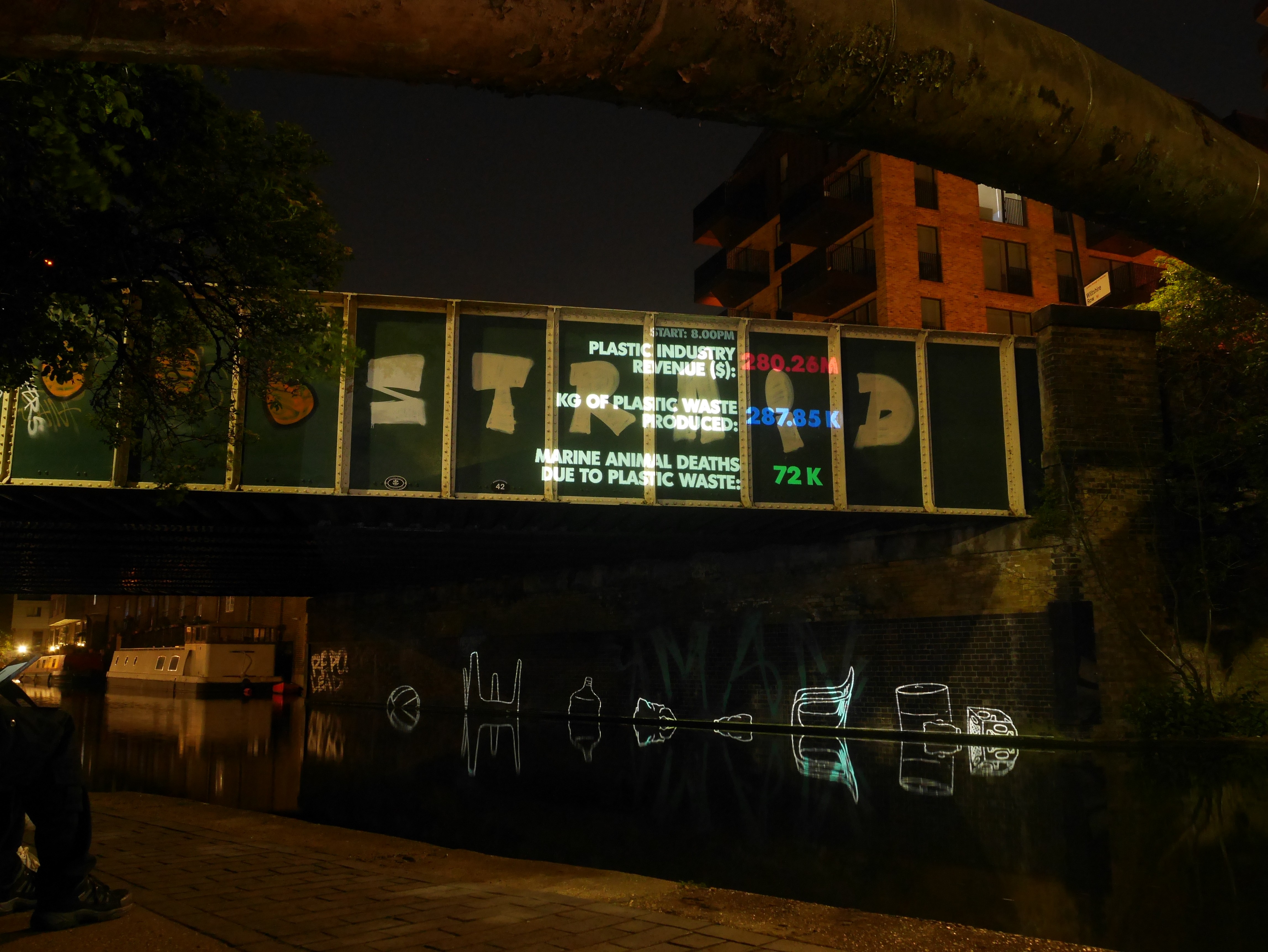 SEE is a three-part multimedia installation using guerrilla projections, data visualisation, and documentary filmmaking to expose the unsustainable and often unethical design of cities. Through real-time global data and animated overlays, I revealed the invisible systems behind housing, transport, and waste management in London. The project culminated in a six-minute video that takes viewers on a three-day journey through the city, showing how environmental harm is embedded in the structures we live among.