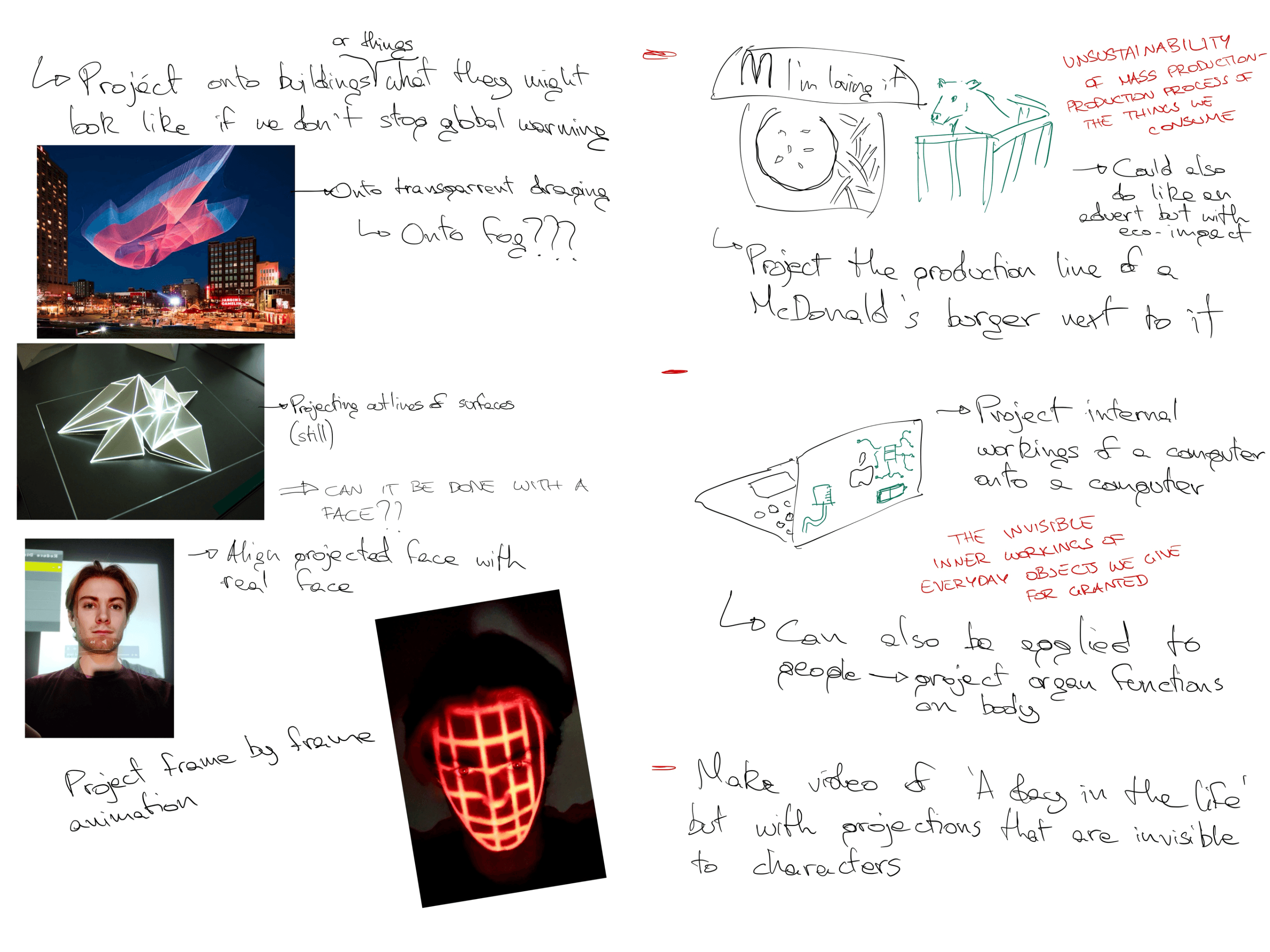 Through my projection mapping and animation I aimed to use the projector as a spyglass to a deeper invisible truth that lies behind most places and objects that sustain our modern way of life. I wanted to make the most of being in London and select a few locations that are the most ‘invisibly’ unsustainable, and project onto them at night. Using light also meant I had few limitations of scale. The project scope therefore became to impact anyone’s perceived experience of these locations by revealing their true nature.